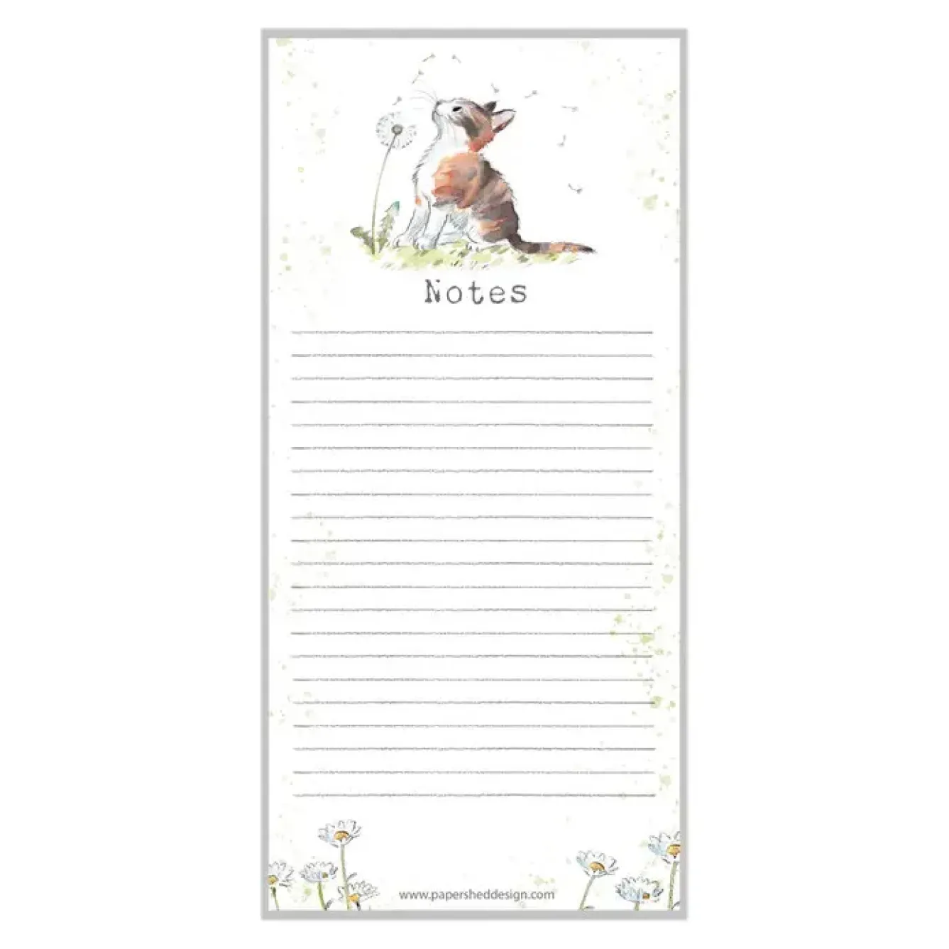 Paper Shed Designs is a beautiful range of stationery printed in the UK on quality sustainable board. This handy lined list pad is adorned with a watercolor illustration of a sweet cat with a dandelion and has a convenient magnetic strip for hanging.
