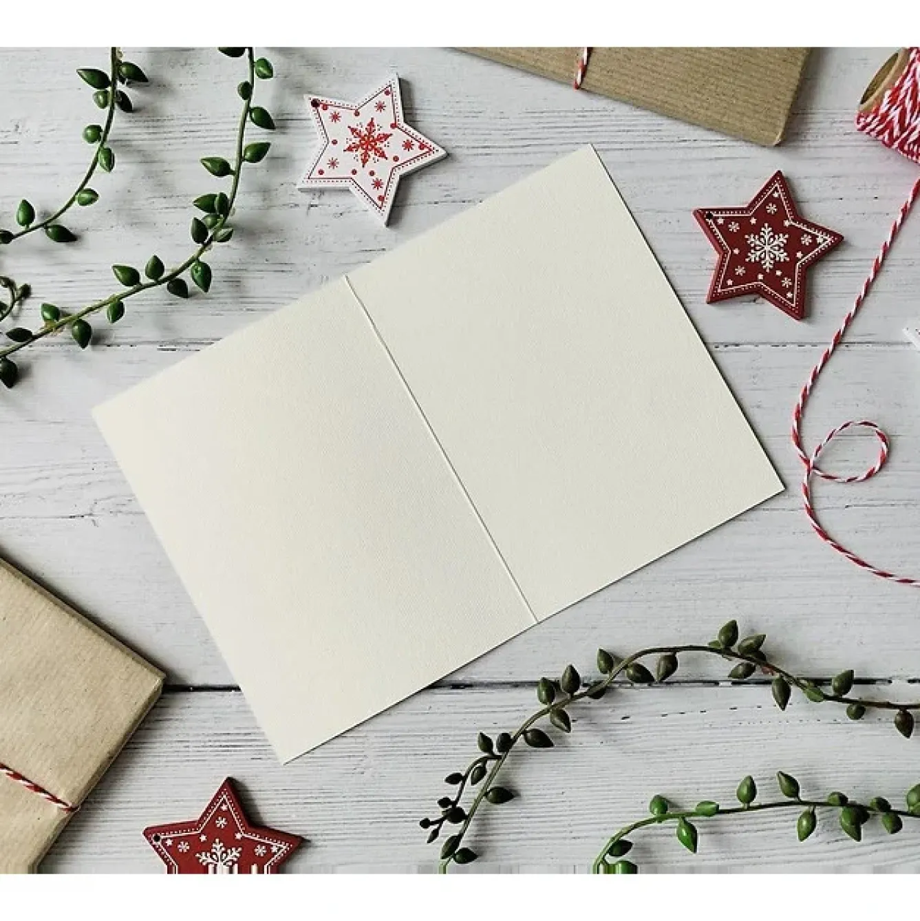 Luxury A6 Christmas card by Becky Amelia, printed in the UK on textured Aquerello paper. Each card comes packaged with a Kraft paper envelope and a compostable cellophane sleeve. Blank inside.