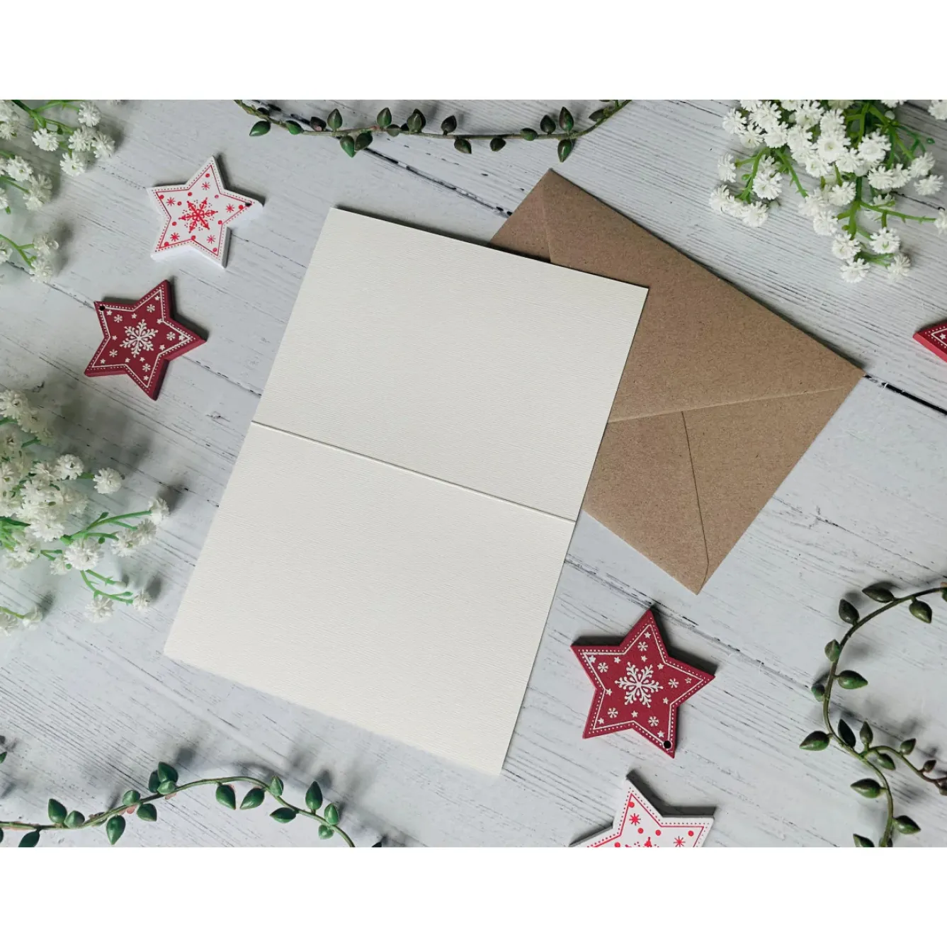 Luxury A6 Christmas card, printed in the UK on textured Aquerello paper. Each card comes packaged with a Kraft paper envelope and a compostable cellophane sleeve. Blank inside.