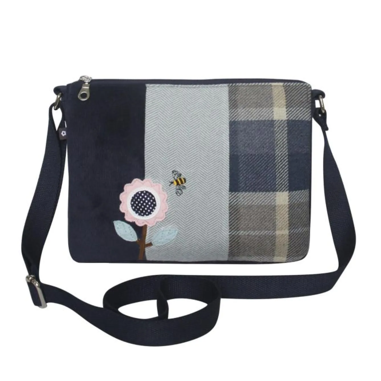 Earth Squared Bags Bags-Blue Tweed Applique Pink Sunflower Messenger Bag