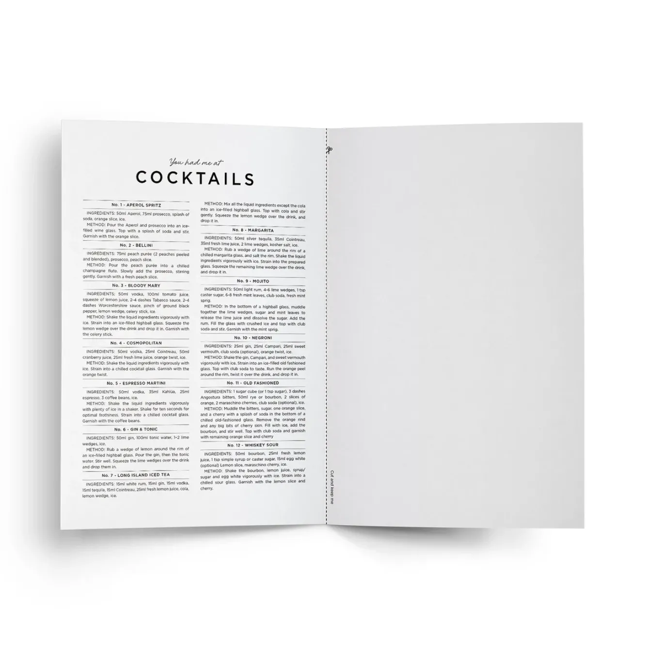 The card doubles as a cut-off cocktail recipe guide with the ingredients and methods printed on the inside left which the recipient can use to master all 12 classic cocktails. The inside right is blank for your handwritten note. The perfect keepsake for the cocktail lover in your life.