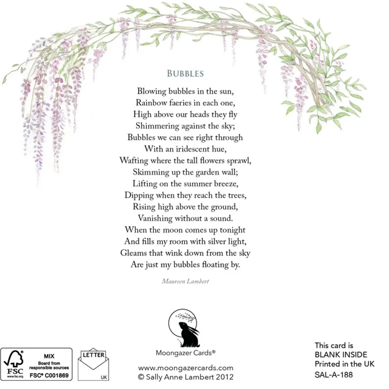 Moongazer Cards illustrate a poem printed on the reverse of the card. This card features a poem about blowing bubbles.