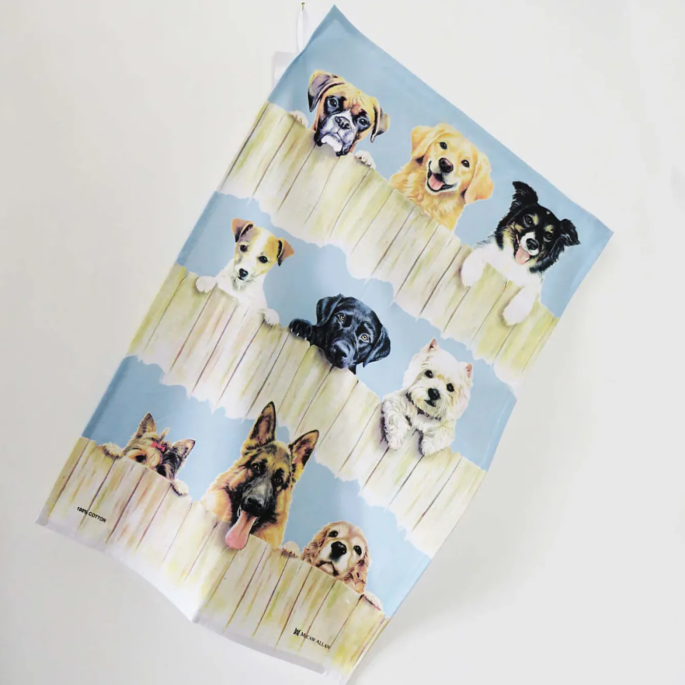 Dog breeds tea towel featuring a variety of dog breeds including Jack Russel, Welsh Corgi, Terrier, Labrador, , Scottie. From Samuel Lamont.