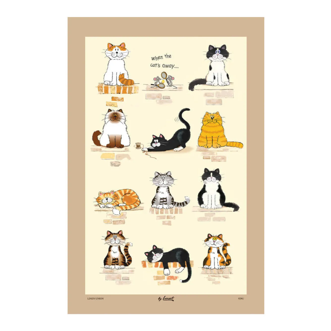 Ginger, Tabby, Black & White and Grey Tabby Cats posing of the top of a wall! Spot the two mice playing a game of tennis! From Samuel Lamont.
