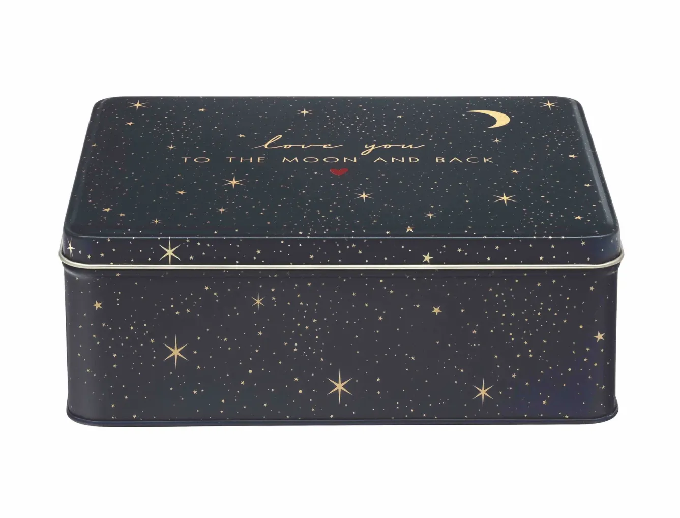 This elegant Sara Miller Little Gestures Deep Rectangular tin features a night sky with the moon and stars. Perfect for storing your favorite treats or knick-knacks, this tin features the words “love you to the moon and back”.