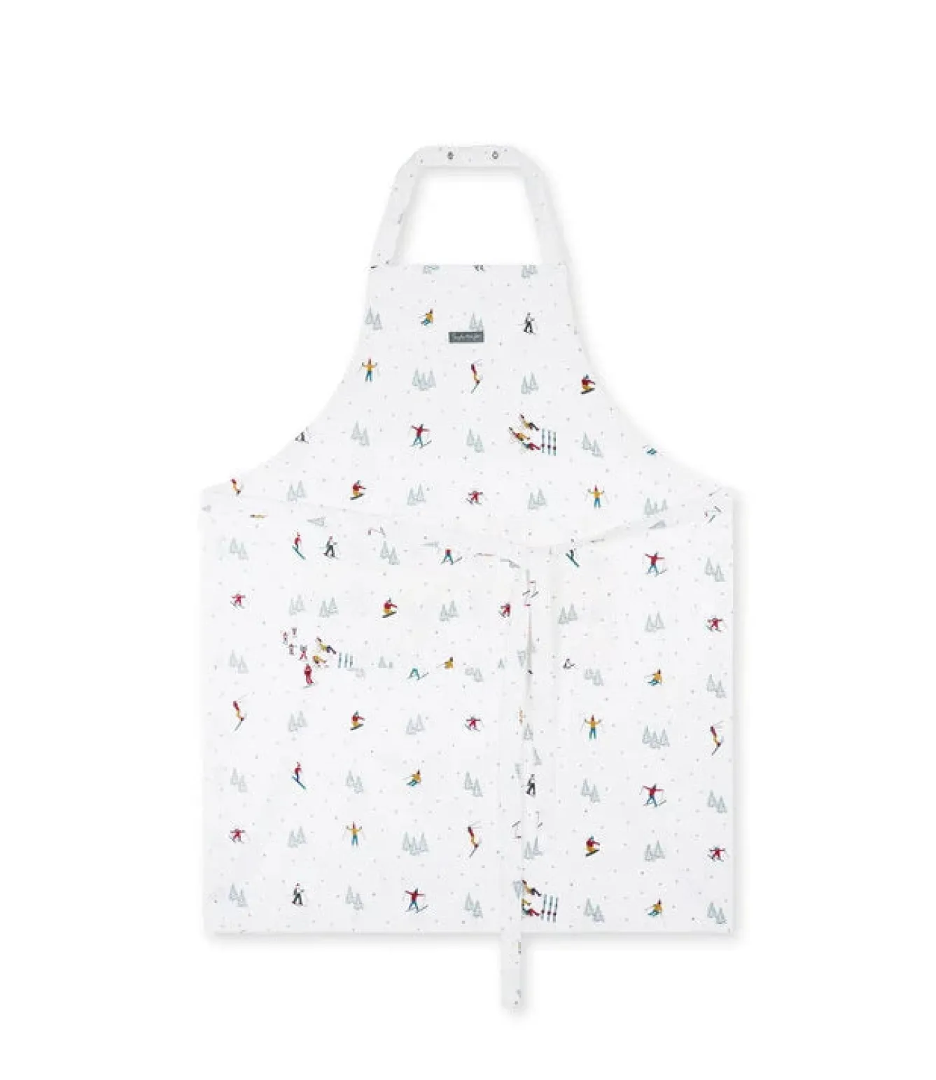 This cotton apron features snowboarders and skiers dotting the mountain in colourful outfits, snaking their way through the snow-capped fir trees. A modern winter design that’ll brighten up any kitchen.