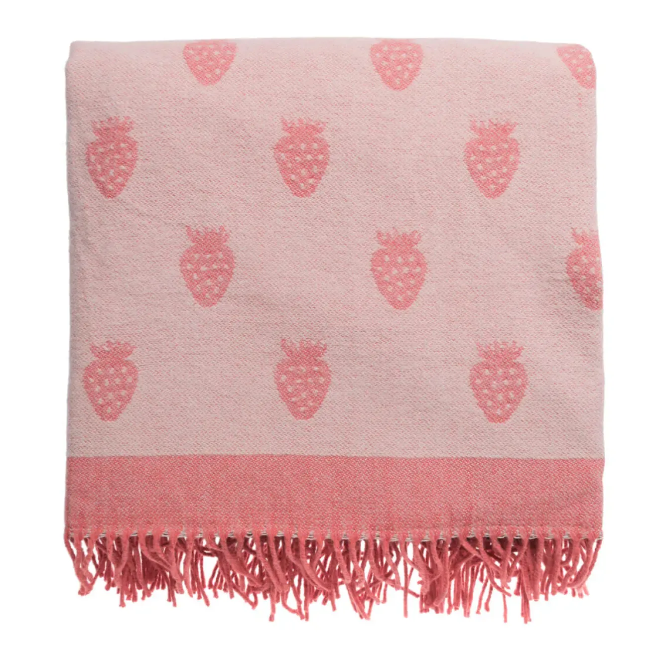 Make picnic and beach trip memories sweeter with this practical and stylish picnic blanket from our Strawberries collection. Featuring Sophie’s strawberries silhouettes on a blush pink ground colour, it is perfect for family days out or taking a snooze in the sun. The faux leather straps make it easy to carry around, whilst the water-resistant backing is perfect for keeping you dry if the ground is wet.Â