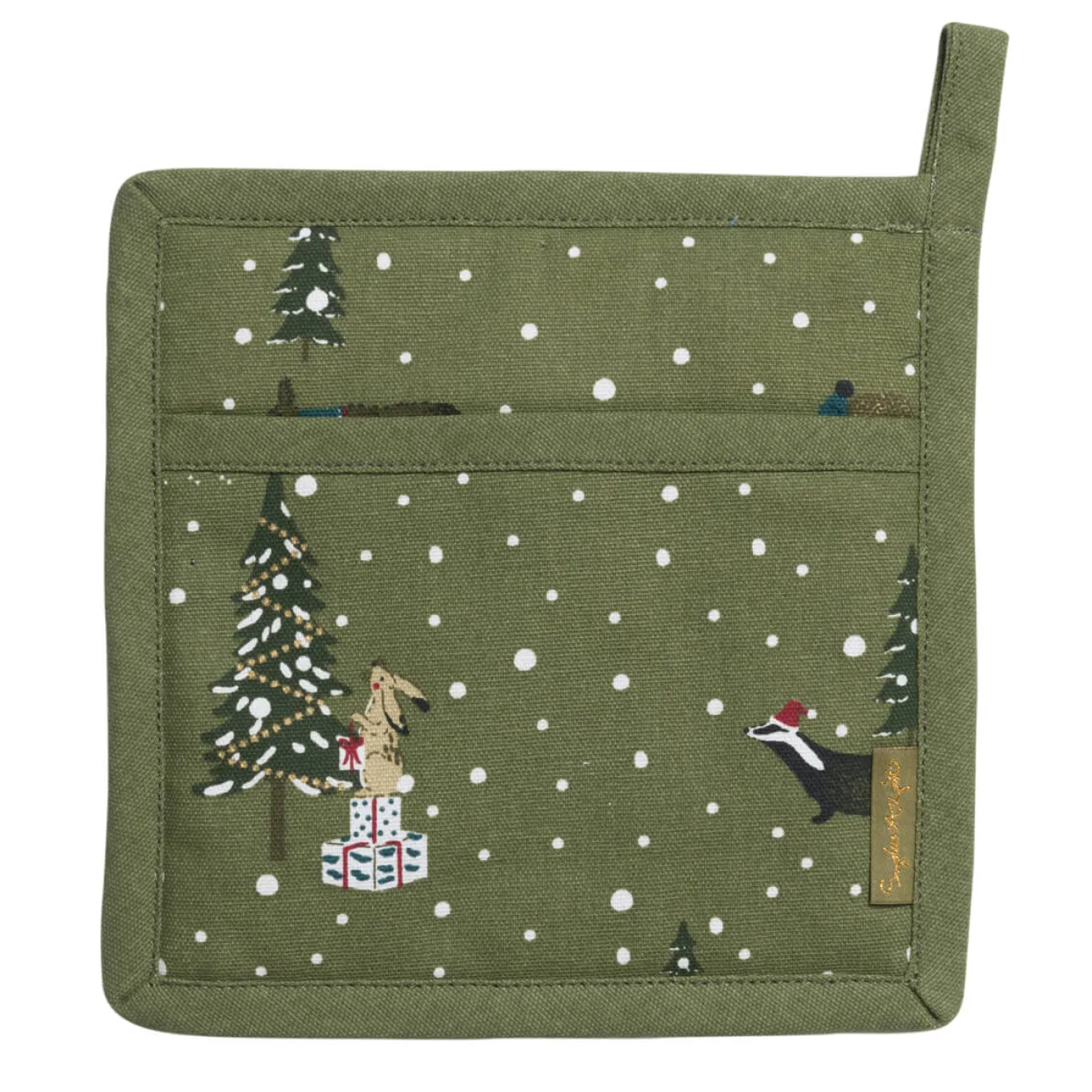 A practical and essential kitchen accessory, perfect for moving pots and pans around the kitchen. This pot grab is sure to add some festivity to your kitchen, dotted with hedgehogs, badgers, hares and squirrels in a snowy festive forest on a rich olive ground. Made from 100% cotton with internal padding for excellent insulation.