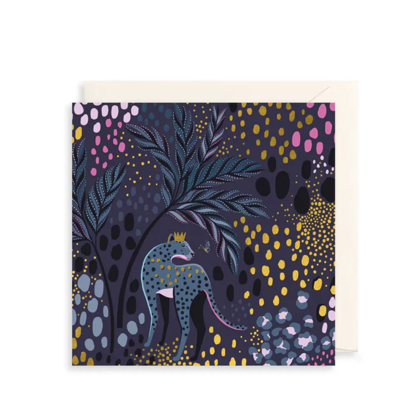 Celebrate a birthday with this luxury greetings card. This card features a majestic cheetah in a beautiful gold botanical jungle.