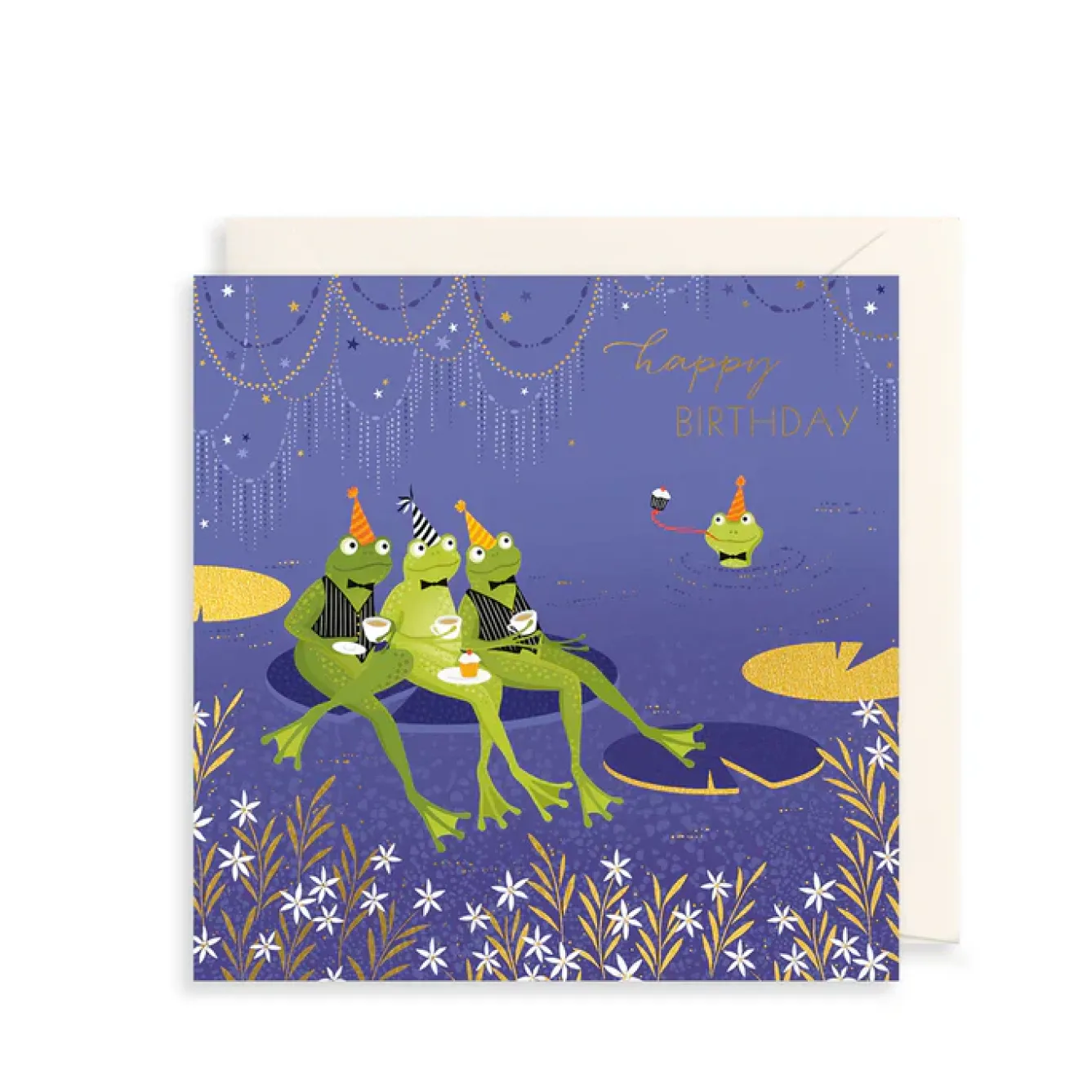 Celebrate a birthday with this luxury greetings card. This birthday card features three frogs having a tea party on a lavender lake. The card reads “happy birthday”.
