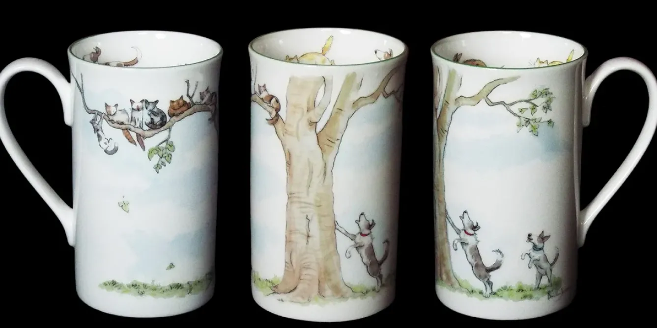A charming tall Bone China mug by artist Anita Jeram. This mugs shows two fun dogs barking up a tree at a group of cats hanging out on the tree branch! The unusual shape holds 10 fl oz and is hand decorated in Staffordshire, England.