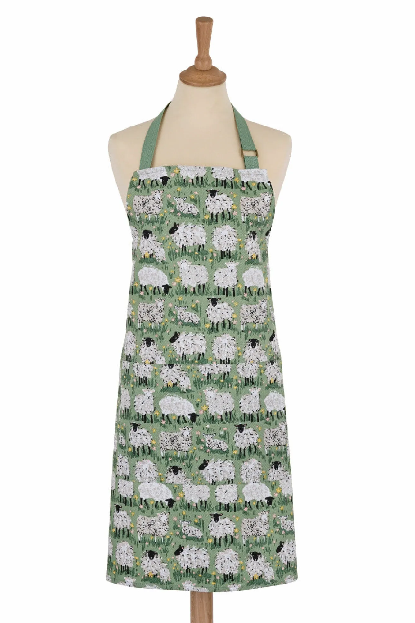This apron is from the Woolly Sheep range by Ulster Weavers. Featuring an adorable flock of playful black and white-faced sheep set against a tranquil fern green background dotted with yellow and pink flowers, beautifully finished with coordinating trim colors for a cohesive look.