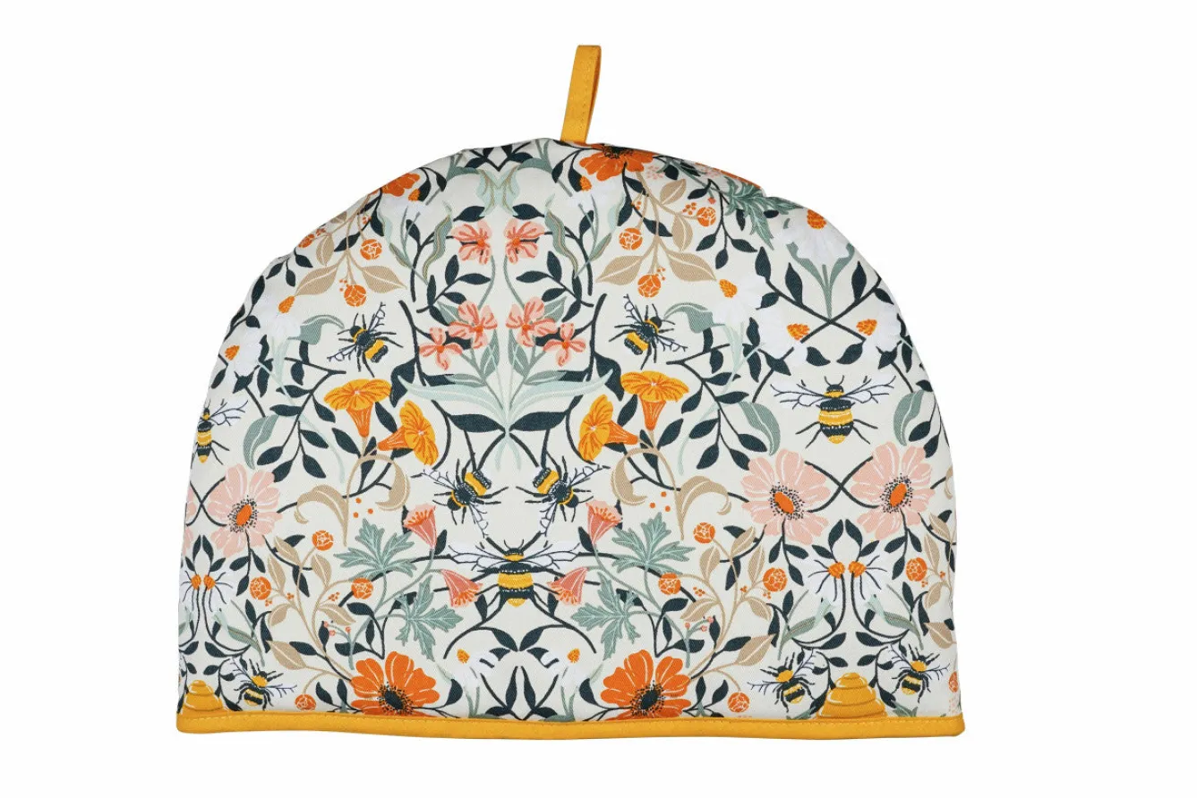 A design inspired by peoples’ love for bumble bees and beekeeping, this tea cosy features the industrious insect buzzing around a meadow like scene dotted with hives and pink and orange flowers. The soft oatmeal colour background gives a natural finish with the pops of flowers. This tea cosy will keep your teapot warm even on the coldest of days.