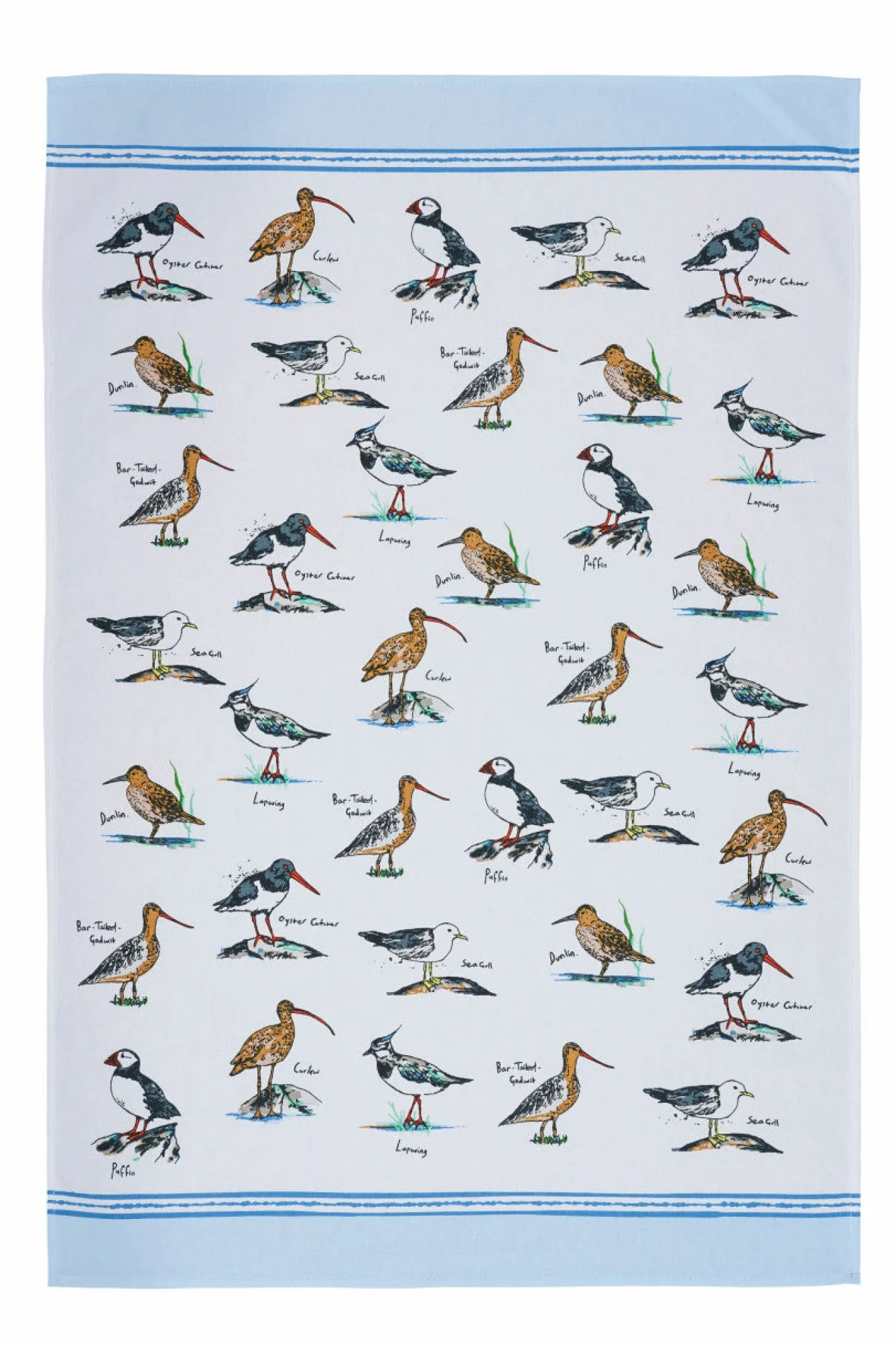 A delightful Coastal Birds tea towel featuring the Puffin, Sea Gull, Oyster Catcher, Lapwing, Bar-Tailed Godwit, Dunlin and Curlew. These striking birds stand out on a white background with a pale blue trim to the top and bottom. 100% cotton. Machine washable. Folded with a branded tag.