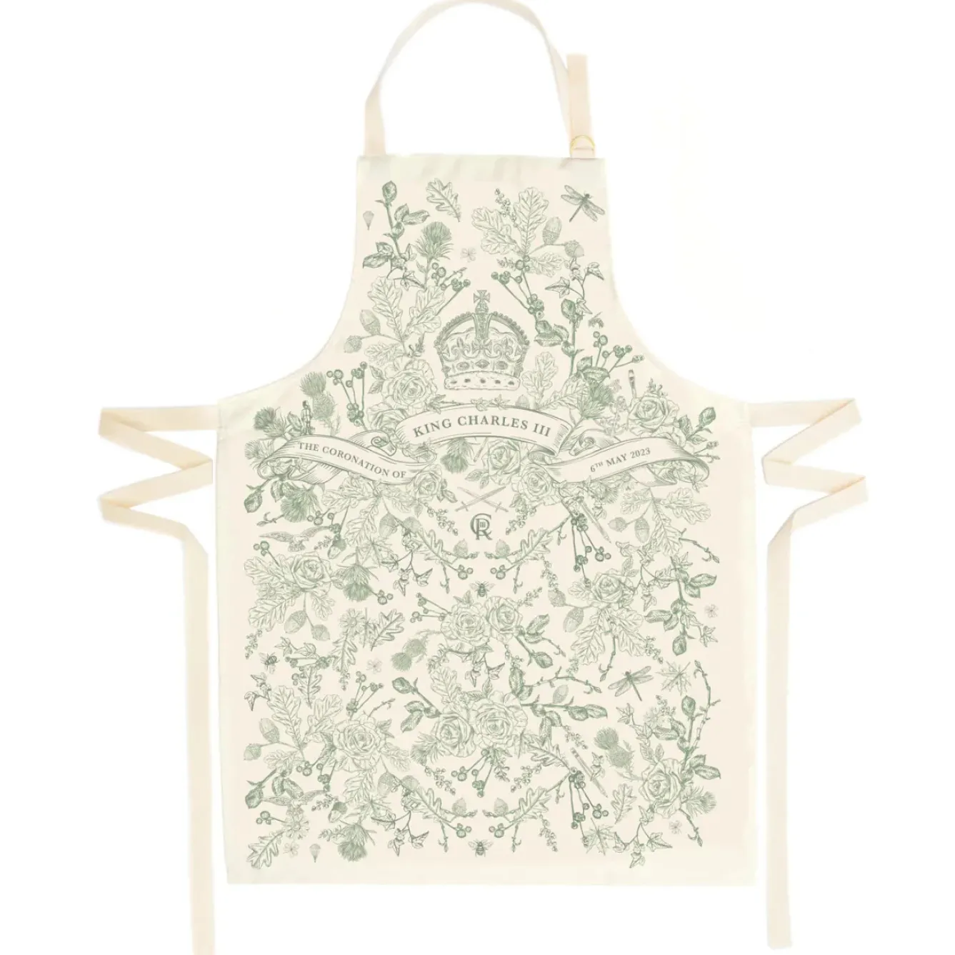 The King Charles III Coronation apron bears the National flowers from the UK along with oak, a symbol of strength and stability, and Ivy, the symbol of commitment, which trails throughout this intricately hand-drawn design.