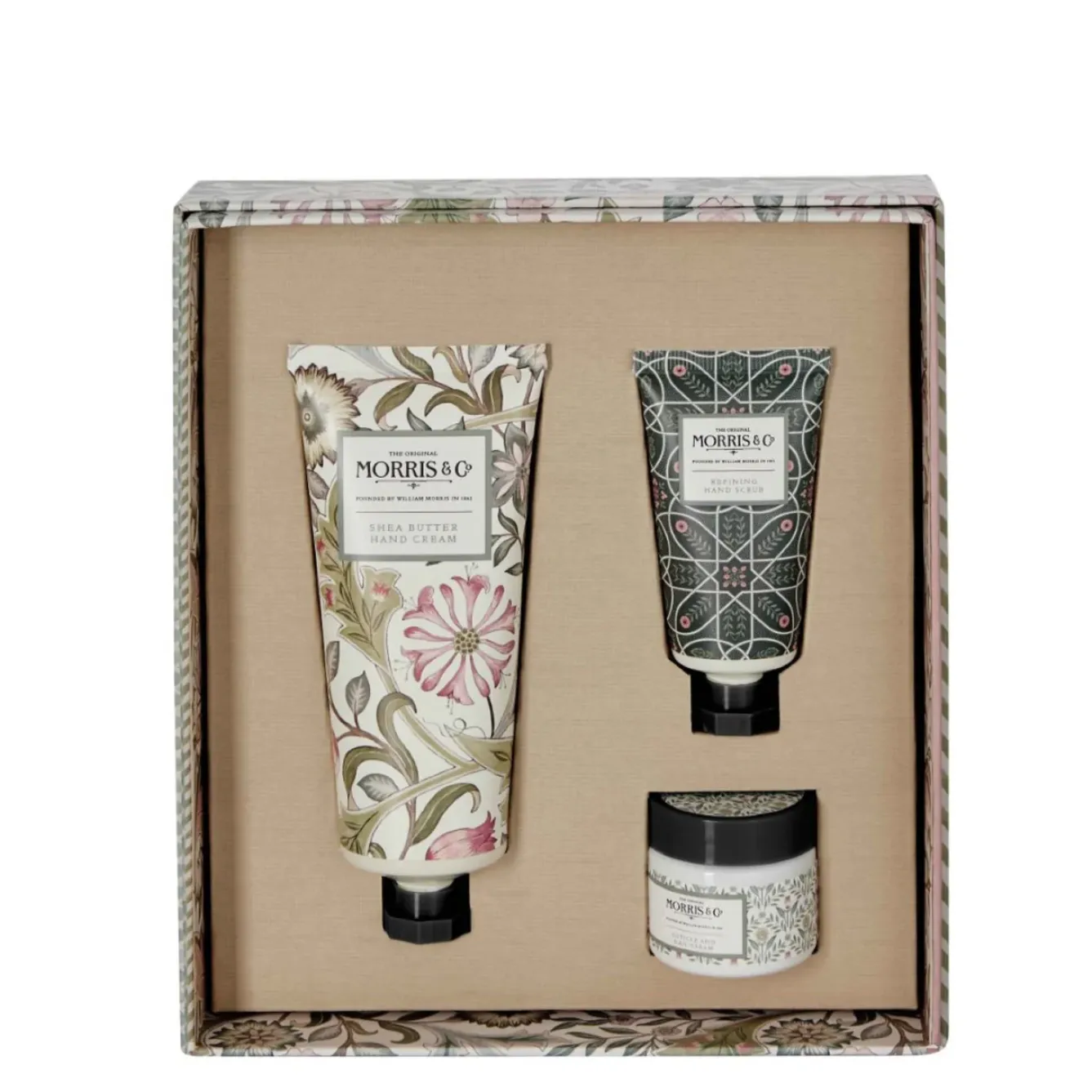 - Box decorated with the Wilhelmina print which was created by combining elements from two embroideries from the William Morris archives. Vegan Friendly formulations.
