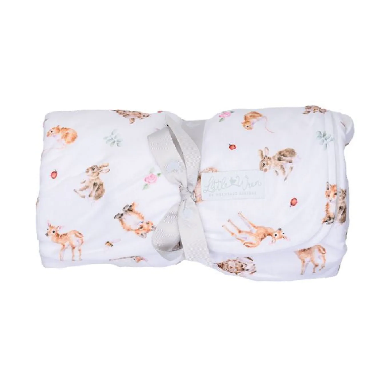 This beautifully soft Little Forest baby blanket is perfect for a new arrival or expecting parents and features lots of baby animal illustrations. Each blanket features an all over pattern on a white background with a soft touch reverse. Beautifully packaged plastic free in a branded grosgrain ribbon and feature a branded woven label. 100% cotton, reverse 100% soft touch polyester. Machine washable. Unfolded measures 35 x 27 inches.